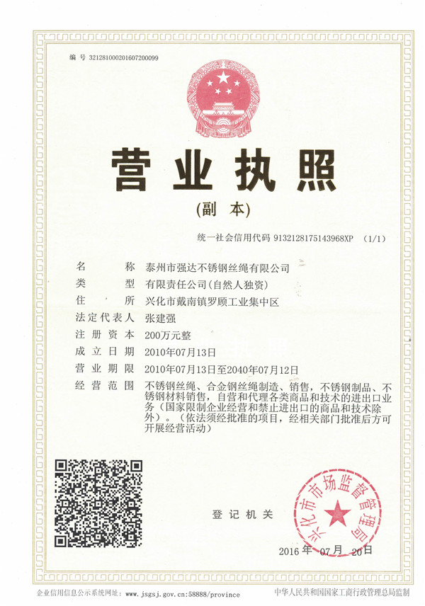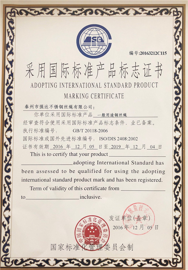 泰州市強(qiáng)達(dá)不銹鋼絲繩有限公司位于江蘇興化市戴南經(jīng)濟(jì)開發(fā)區(qū),公司致力于不銹鋼絲繩產(chǎn)品生產(chǎn),立志成為“國內(nèi)技術(shù)標(biāo)桿型吊索具生產(chǎn)企業(yè)”。以此戰(zhàn)略思想指導(dǎo),公司堅決貫徹“質(zhì)量贏市場,管理增效益,誠信贏天下”的質(zhì)量方針。以完善的服務(wù)在國內(nèi)不銹鋼絲繩市場樹立良好的品牌形象。公司榮獲“江蘇省質(zhì)量信得過企業(yè)。 靈活的管理機(jī)制,經(jīng)驗豐富的